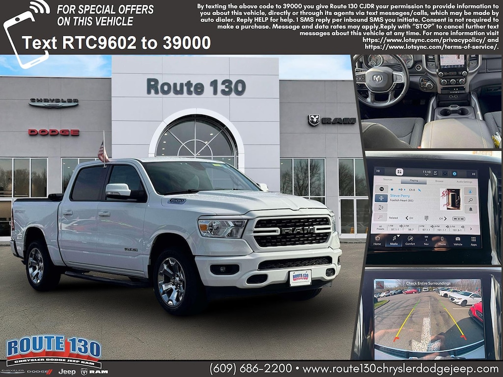 Pre-owned 2022 Ram 1500 Big Horn 4x4 Crew Cab 5'7" Box with only 28,021 miles. Powered by the smooth and efficient 3.6-liter Pentastar V6 engine paired with an 8-speed automatic transmission and eTorque mild-hybrid system, it delivers strong torque and confident towing. The Bright White exterior looks sharp against the black cloth interior, and the spacious crew cab seats up to six comfortably. Big Horn features include Uconnect infotainment with Apple CarPlay and Android Auto, power driverâs seat, remote start, dual-zone climate control, and a spray-in bedliner with LED lighting. Four-wheel drive and a trailer tow package make this truck ready for work or weekend adventures. Retail $41,995, special price $34,895 â" test drive this versatile pickup today!